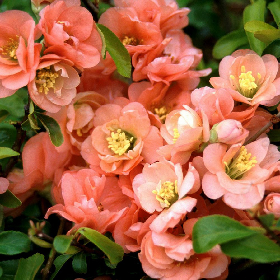 Айва великолепная камео - это удивительное растение с изысканным лососевым цветом цветков и желтыми плодами. Ее ствол обладает небольшим количеством шипов, что делает ее безопасной для окружающих. Растение достигает высоты 100-120 см, что делает его идеальным для альпинариев, групповых посадок, живых изгородей или одиночных посадок.
