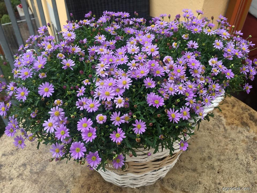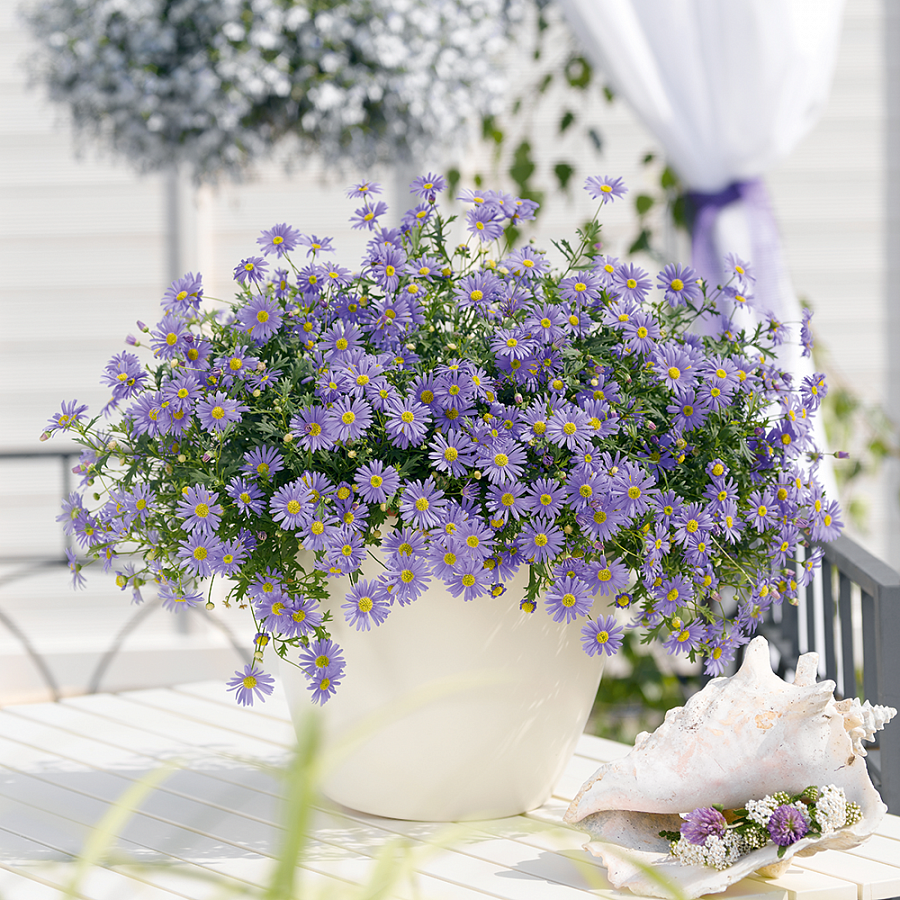 Саженцы Брахикомы обыкновенной Браско Виолет (Brasco Violet) наполнят цветник трогательной простотой и изяществом. Травянистые пышные кустики с ажурной листвой, высотой 30 или 50 сантиметров, уже в июне покрываются многочисленными бутонами. Цветки – простые ромашки, голубого или сиреневого оттенка с желтой серединкой, обильно покрывают кустик на протяжении 2 месяцев.