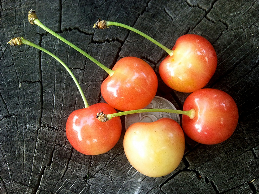 Саженцы черешни Юлия высокорослые деревья,высота взрослого дерева 7-8 м. Плоды вызревают в июне-июле, очень привлекательны на вид и вкусны, некрупные (5-6 г). Ягодки плотные (группы бигарро), сладкие с нежной кремовой окраской и розовыми растушеванными боками, по 2-3 в соцветии. Нарастание урожайности крупномера начинается на 5-6 год и идет медленно. В зрелом возрасте возможен урожай до 110 кг/дер. Требует подсадки донорских сортов с цветением в тот же период для перекрестного опыления. Актив сорта: