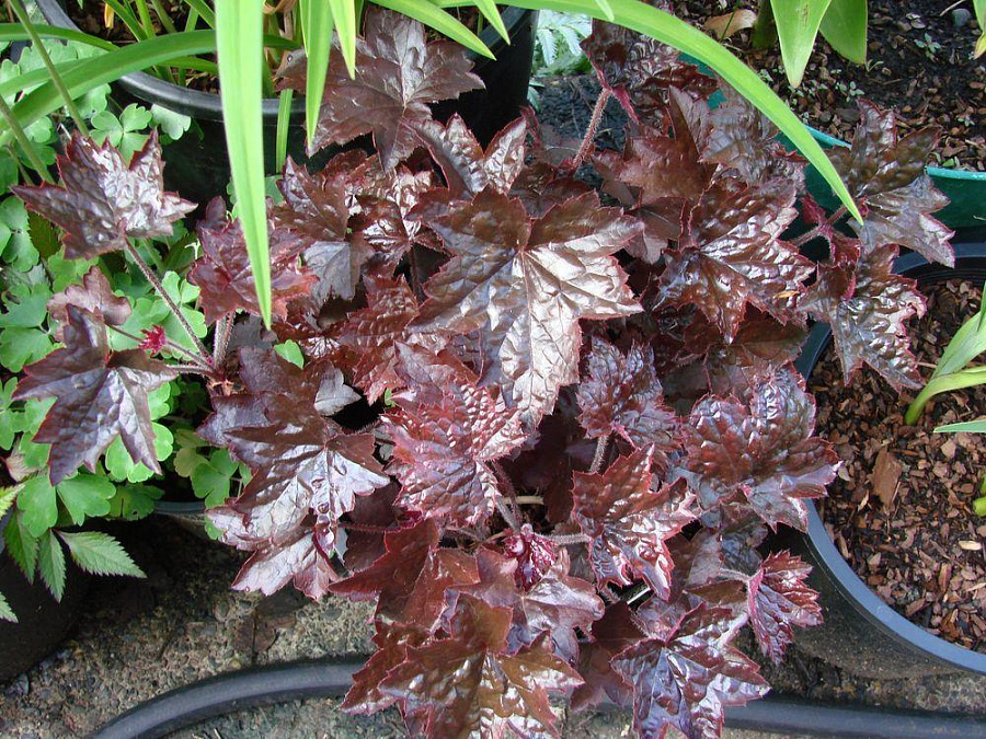 Рассада гейхеры Блэкаут (Blackout) – отличный вариант для дополнения смешанных посадок, декорирования искусственных водоемов и оформления альпийских горок. Многолетник с темно-пурпурной листвой и бело-розовыми цветочками украсит любой садовый объект. Особенностью сорта является блестящая поверхность листьев.
