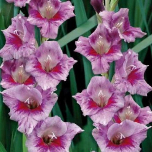 Сиреневая нежность цветков этого растения завораживает. Гладиолус гибридный Сакраменто (Sacramento) обладает такими прекрасными цветками, что можно поставить их на первые места на любых выставках. Диаметр цветка до 14 сантиметров. Первоначально появляется розовый бутон, постепенно окрашиваясь в необычный сиреневый цвет. Центр окрашен в яркий оттенок, плавно расплывающийся к гофрированному краю. Высота цветоноса до 120 сантиметров, причем 80 из них занимает сам цветок. Предпочитает легкие песчаные почвы, солнечные места. Отлично смотрится в клумбах и в миксбордерах. Начинает цвести в середине лета и дает прекрасные цветы для букетов по конец сентября.