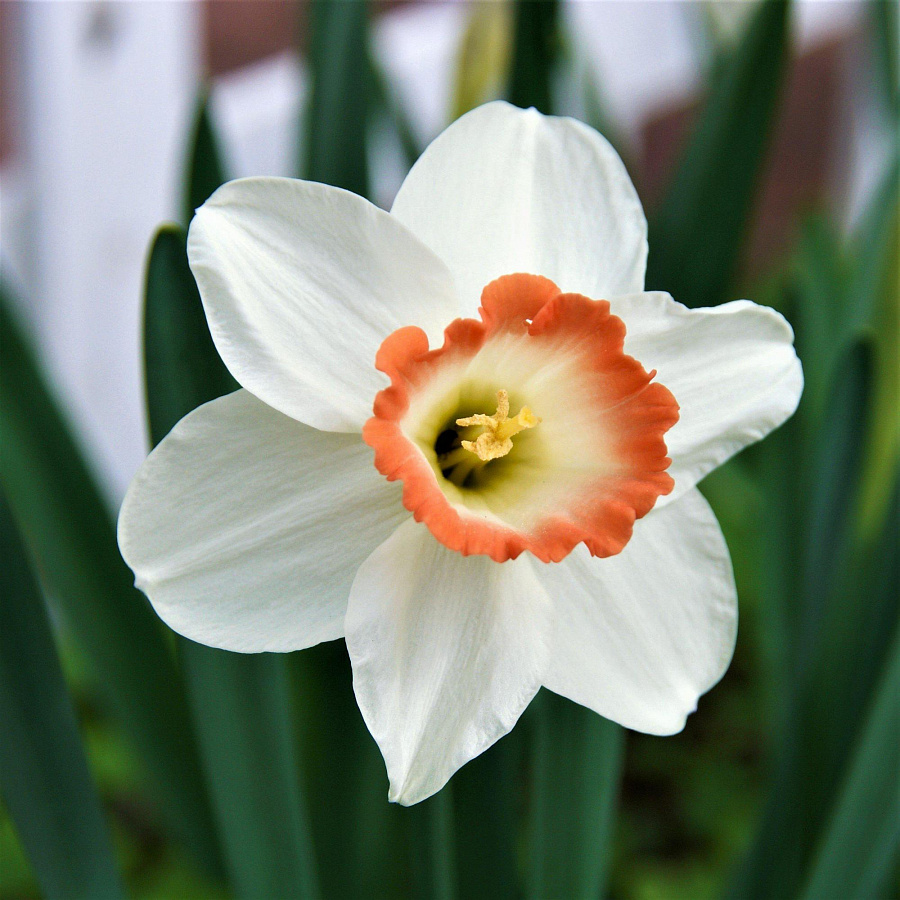 Окраска цветка : сочетание белоснежного цвета лепестков с абрикосово- красным, волнистым краем коронки